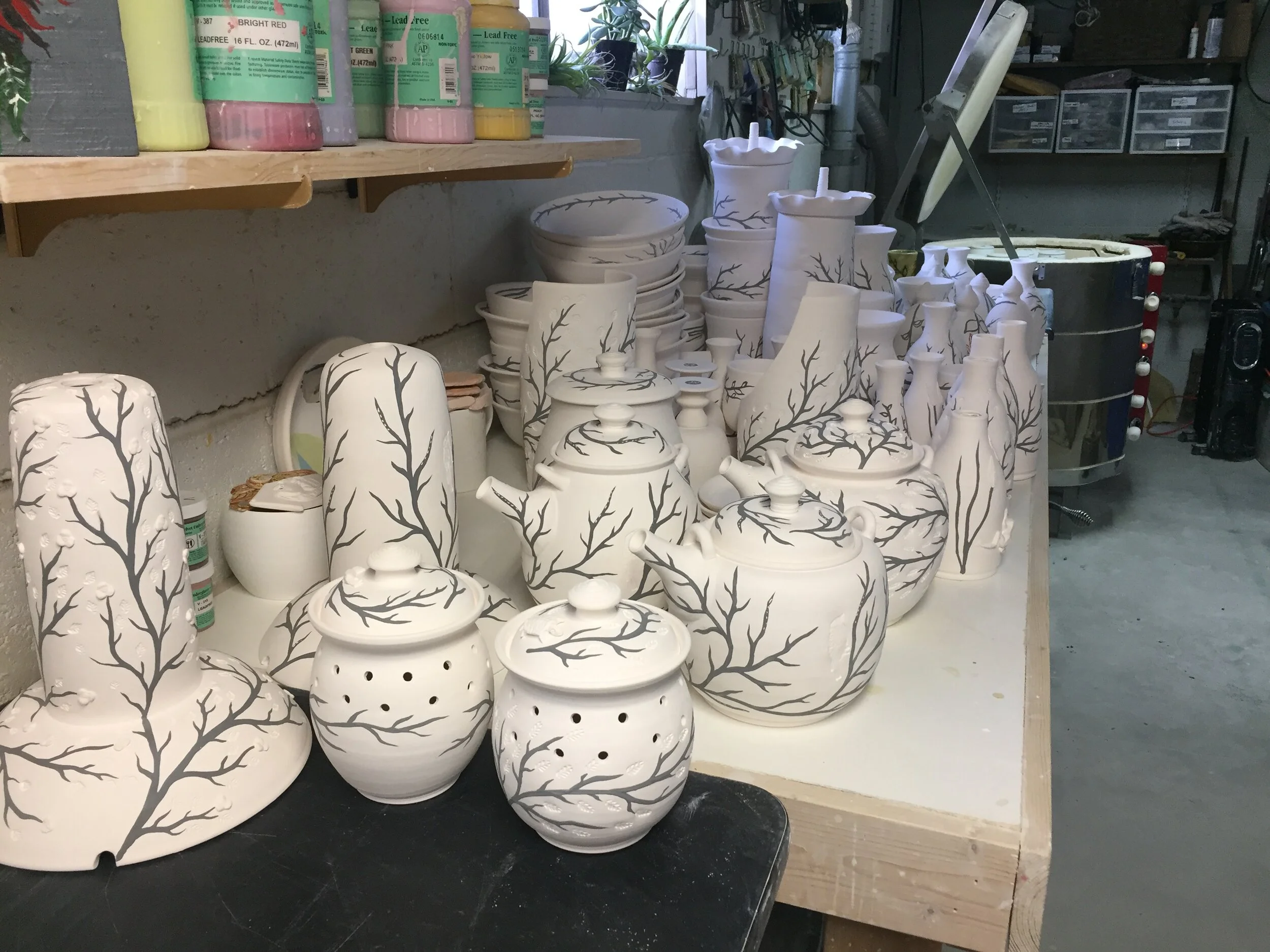 After the pieces are completely bone dry, they are loaded into a bisque kiln and fired to 1915 degrees.